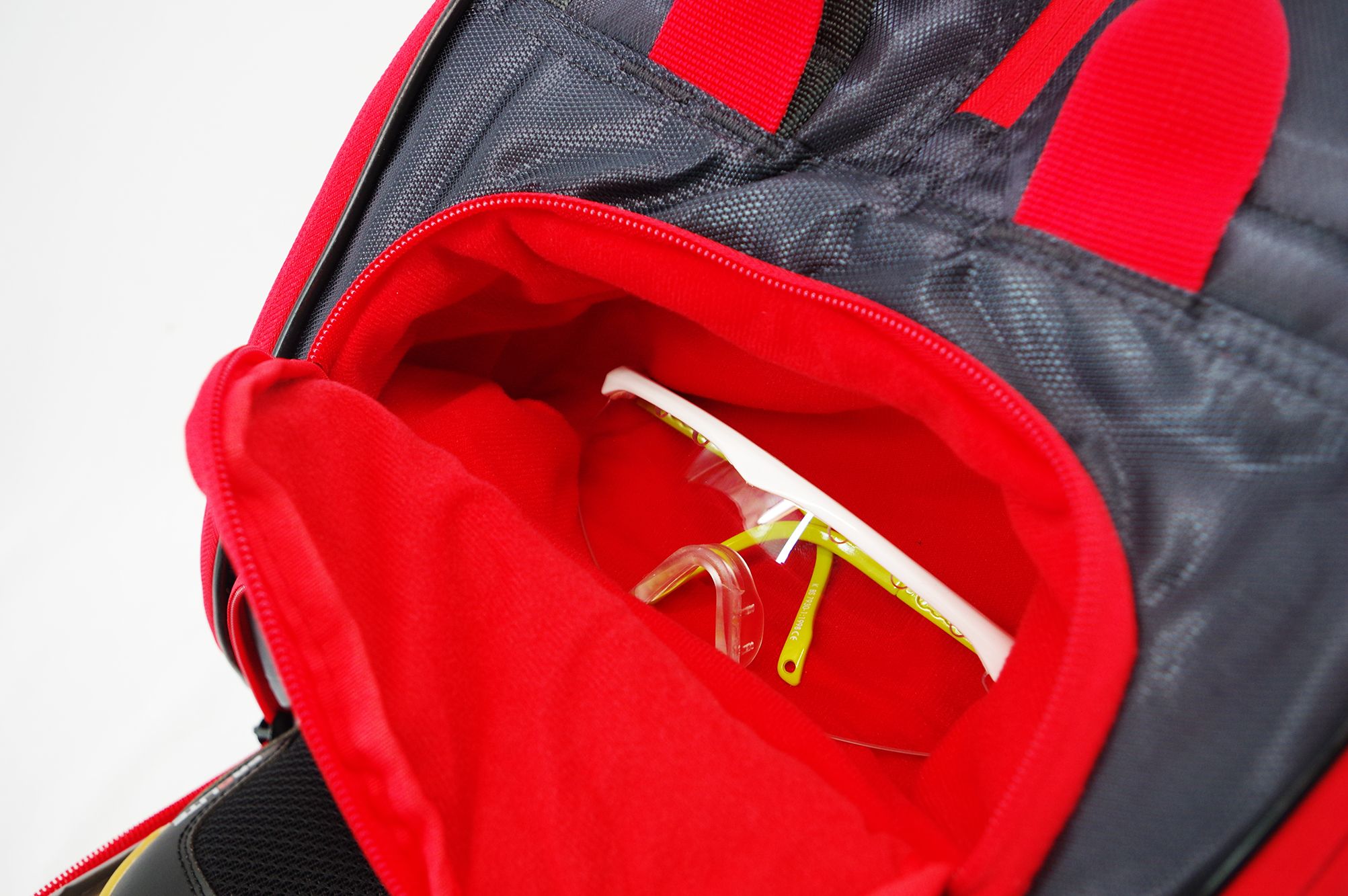 It has the same backpack carry system and comes with 2 separate racket compartments a central kit compartment and separate pocket for shoes. It also has the new soft pocket to protect your goggles/glasses and side pockets for valuables and is fitted with our breather buttons to aid internal ventilation.
